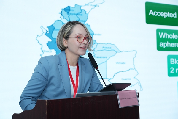 哥伦比亚红会血库医学主任及罗萨里奥大学生物医学科学系医学与健康科学学院职业副教授Dr. Adriana Urbina发表了《哥伦比亚血筛的方法、现状和未来趋势》主题报告。她从哥伦比亚医疗制度及血站分布入手,探讨了当前血筛项目的筛查方法及其挑战,强调了血筛核酸检测具有优越性,能广泛识别病原体突变株,降低感染风险,确保血液安全。同时,她提出了利用分子方法学筛查虫媒病毒等创新思路,并对710公海生物分子血筛检测方案高度赞赏。