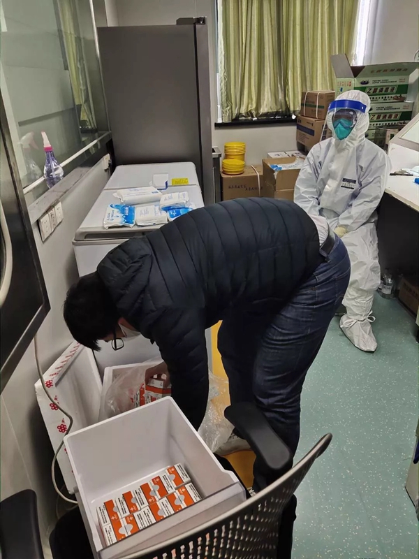 公司总部急赶出来的10万人份新冠状病毒检测试剂盒抵达武汉,工作人员连夜把产品搬入指定单位仓库。