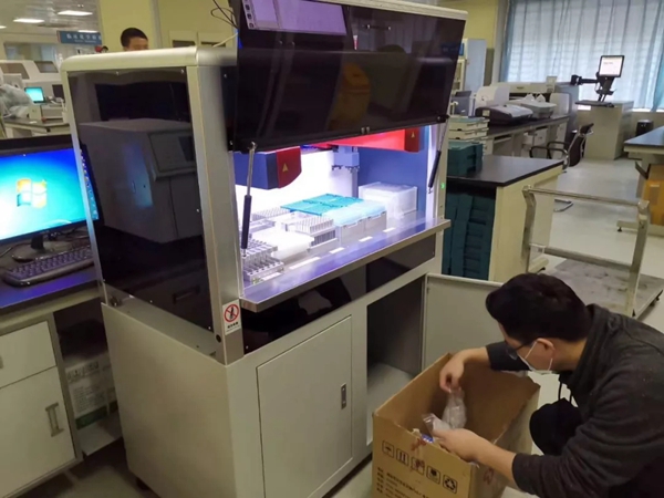 710公海生物捐赠的第一批医疗设备、试剂以及配套耗材,顺利抵达武汉。与当地合作商一起,装运货物入库。